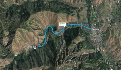 The route along Warm Springs Road starting at the YMCA in Ketchum until the pavement on Warm Springs Road ends (NOT the Baser's’ house). The Basers’ house is 5 miles past this. There is a good turn out for parking a number of cars right where the pavement ends and the dirt begins, if that’s more convenient for you.
